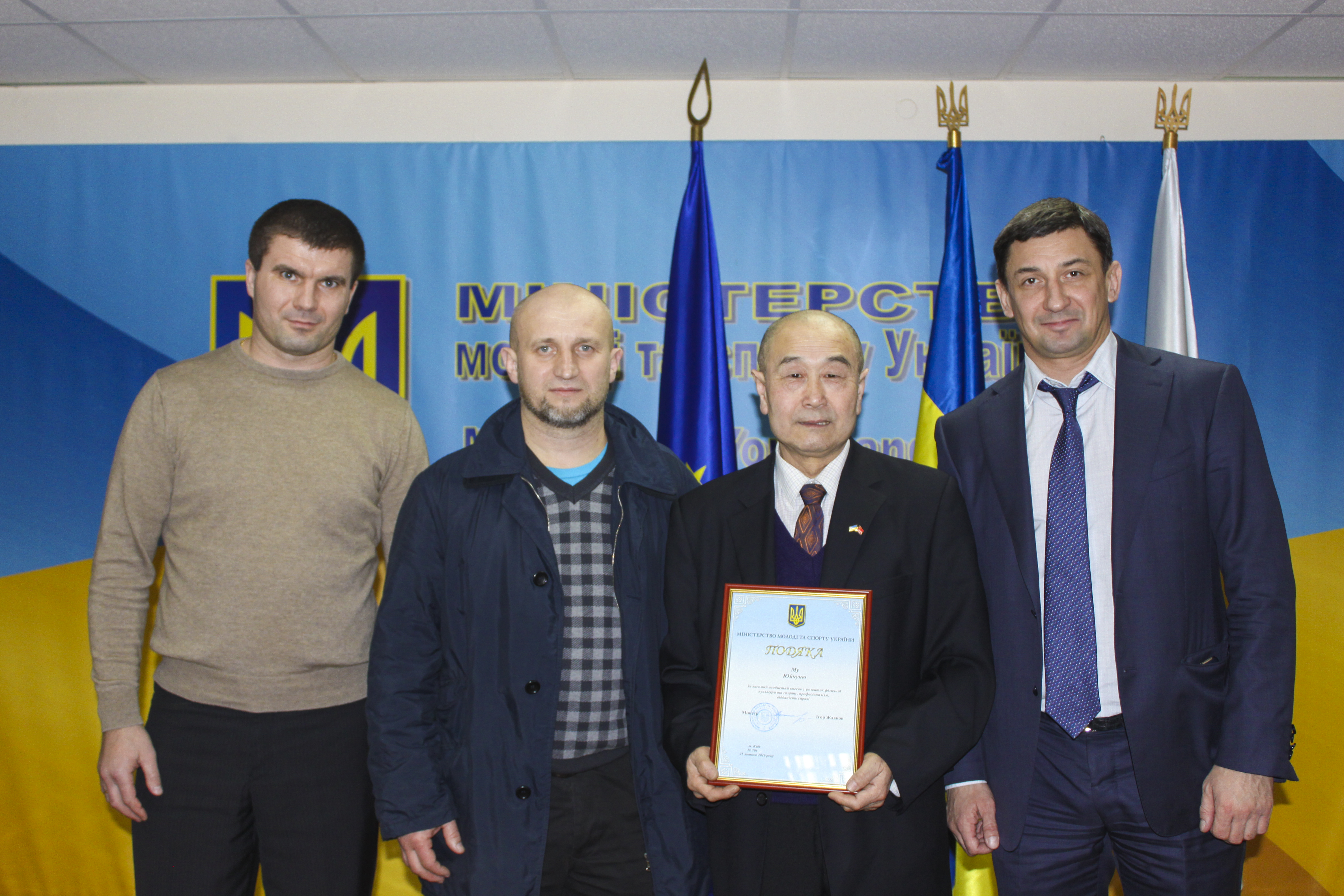 Памятная фотография во время награждения Му Юйчуня в Министерстве молодежи и спорта Украины. Нв фото, Ярослав Мудрый, государственный тренер, Александр Кравчук, ученик мастера боевых искусств Му Юйчуня, Учитель Му Юйчунь и заместитель Министра Ярослав Войтович
